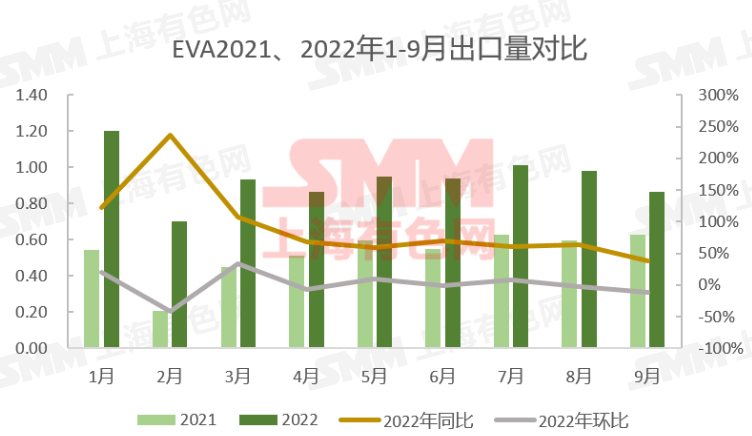 EL測試儀市場顯示:2022年9月EVA進口11.81萬噸,同比增加36%,環(huán)比增加19.43%。今年累計進口86.43萬噸,同比增加14.67%。2022年9月出口0.87萬噸,同比增加37.68%,環(huán)比減少11.54。今年累計出口EVA 8.45萬噸,同比增加79.03%。